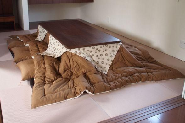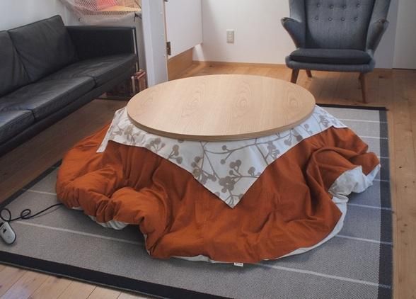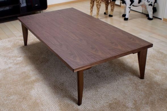 脚は、角材を切り出して制作したスッキリとしたデザインです。 上から見ると三角形の形をした脚は、角材に比べて角が少なくなります。 これは、「こたつ」に入った際に体に「脚の角」が当たり難くする為でもあります。 また、下に向かって脚は細くなっているので「脚間(脚と脚との間の距離)」を広く取る事が出来ます。 取付けたヒーターは薄型のモノを採用し、下から覗かなければ見えません。