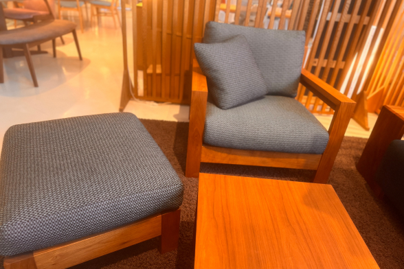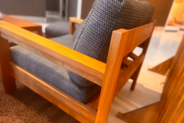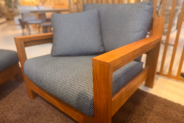 宙に浮いたフィンガージョイントと蟻組が施された美しい後姿と斜めに傾斜するFINE(繊細)な2重留め構造が印象的なソファです。