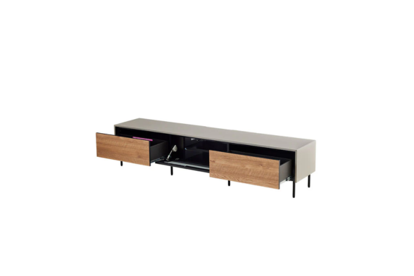 無機質な印象のマットなグレーと、ヴィンテージ調木目の異素材MIX感が楽しいデザイン。リアルな木目の風合いが直線的なデザインの中に温かみを生み、息のつまり過ぎていないこなれた雰囲気を演出します。